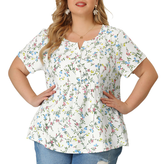 Women's Plus Size Summer Top Floral Half Placket Short Sleeve Blouse