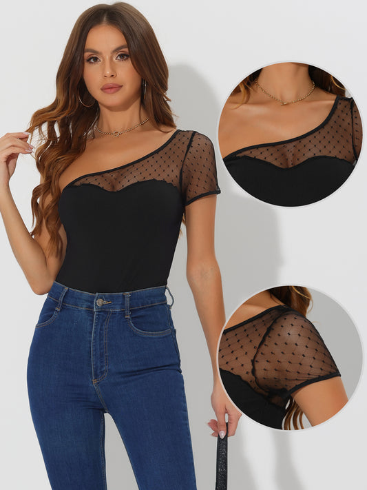Women's Sheer Mesh Sleeve Skinny Sexy One Shoulder Sleeveless Bodysuit