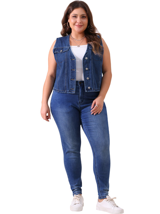 Women's Plus Size Denim Vest Sleeveless V Neck Button Down Casual Jean Waistcoat Jacket