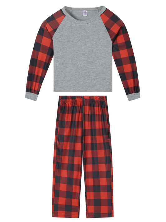 Kid's Christmas Family Pajama Set Red Black Plaid Print and Solid Color Combination Long Sleeve Top Matching Pants