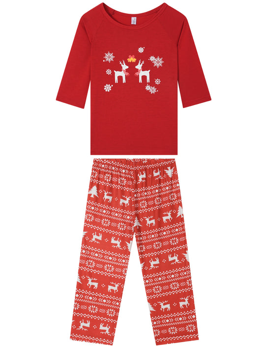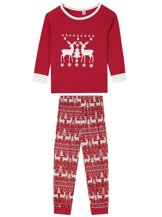 Kid's Christmas Matching Deer Print Long Sleeve Top Cute Print Pants Red Family Pajama Set
