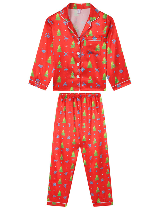 Child's Christmas Satin Long Sleeve Button Down Pajamas Tree Print Festival Party Sleepwear Family Pajamas Set