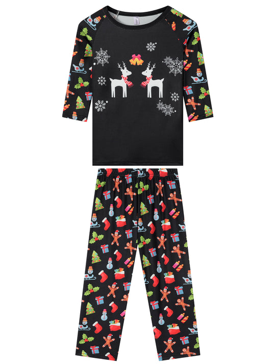Child's Christmas Family Pajama Set Deer Print Long Sleeve Black Top Matching Cute Print Pants