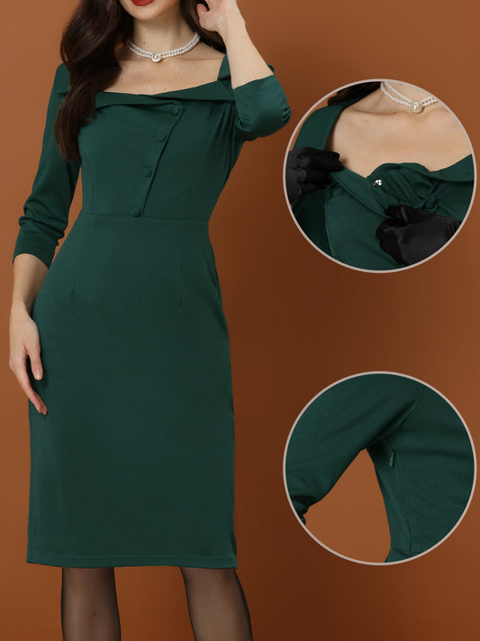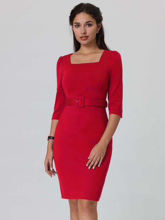 Women's 3/4 Sleeve Square Neck High Waist Formal Party Bodycon Work Pencil Dress