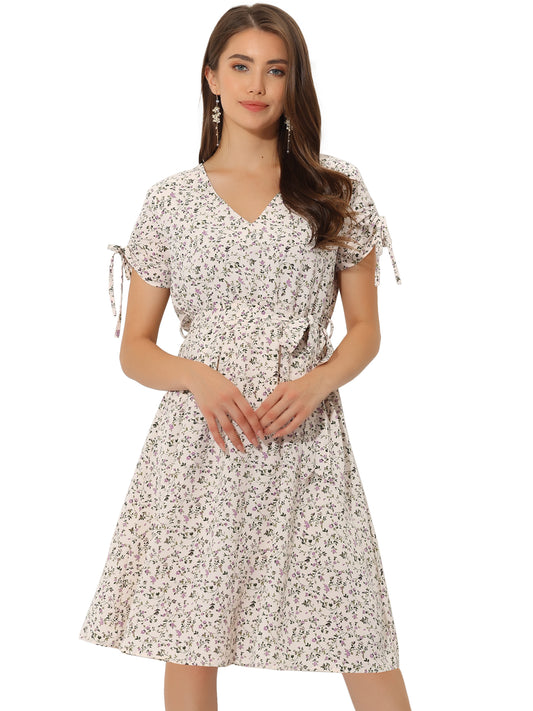 Women's Casual Midi V Neck Tie Cuffs Belted Floral Dress