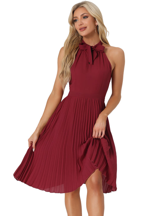Women's Sleeveless Halter Neck Pleated Dress Summer Bow Tie Neck Party Cocktail Dresses