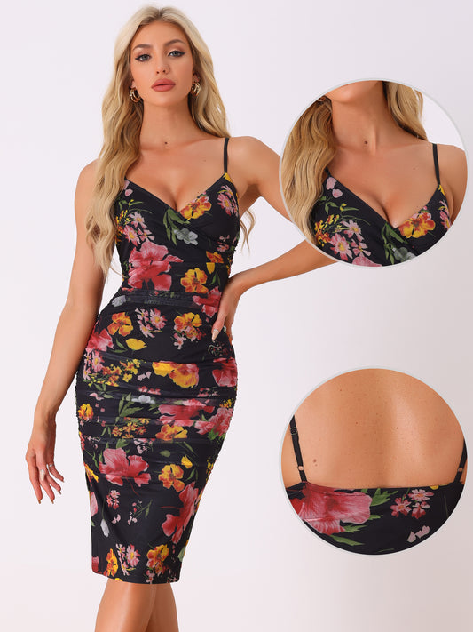Women's Floral Cami Dress Ruched Mesh Side Slit Summer Bodycon Dresses