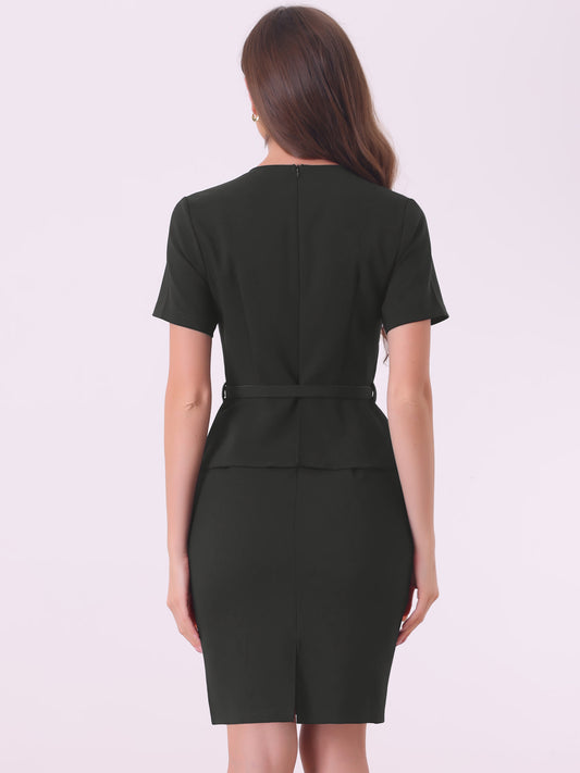 Women's Vintage Retro Belt V-Neck Faux Two Piece Slim Casual Short Sleeve Office Dress