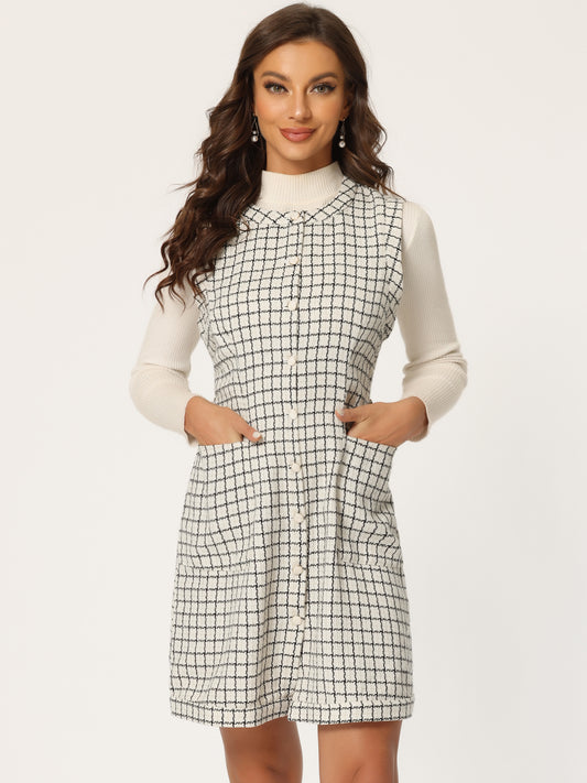 Women's Vintage Pinafore Dress Round Neck Button Down Pockets Sleeveless Plaid Tweed Dress with Belt