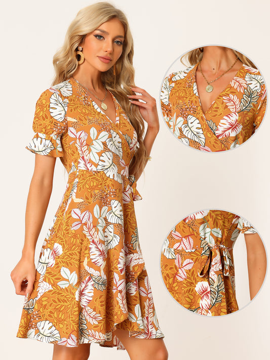 Women's Boho Floral Dress Tropical Tulip Hem Puff Sleeve Tie Wrap Dress