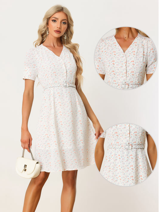 Women's Spring Summer Floral Dress Short Sleeve V Neckline Belted Knee Lenth Dress