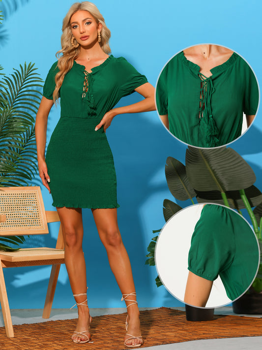 Women's Summer Smocked Dress Puff Sleeve Tie Front Lace Up Bodycon Mini Dresses