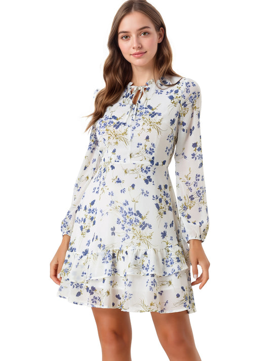 Women's Summer Dresses Floral Tie V Neck Semi Sheer Long Sleeve Layered Tiered Chiffon Mini Dress