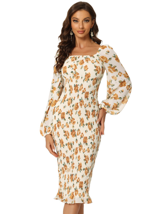 Women's Floral Dresses Mermaid Square Neck Ruffle Puff Sleeve Smocked Bodycon Dress