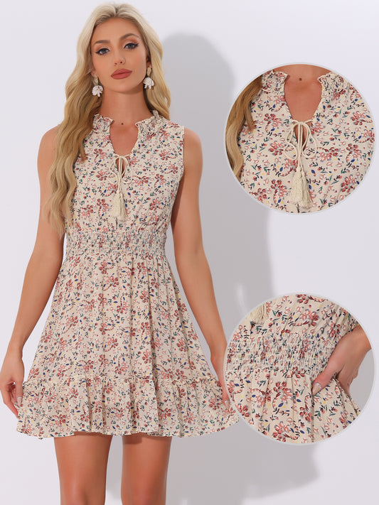 Women's Floral Dresses Sleeveless V Neck Sleeveless Smocked Waist Ruffle Mini Dress