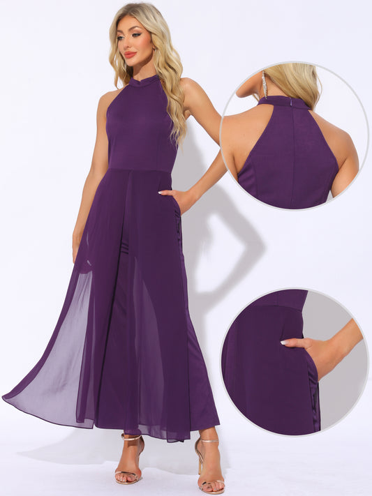 Women's Summer Sleeveless Halter Neck Wedding Chiffon Wide Leg Dressy Elegant Jumpsuit