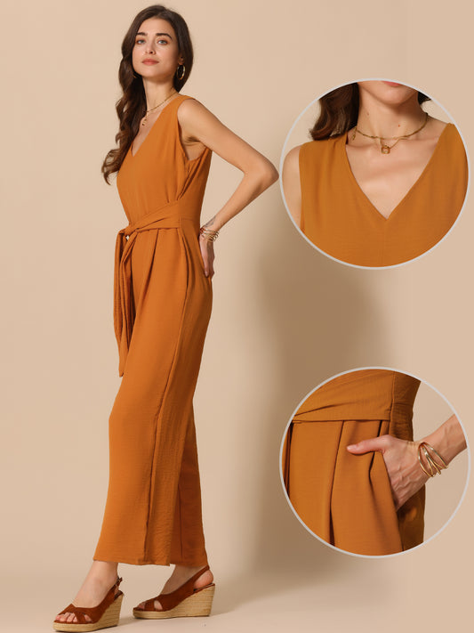 Women's Wide Leg Jumpsuit Sleeveless Collared Tie Waist Coverall Button Down Cargo Jumpsuits