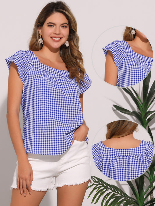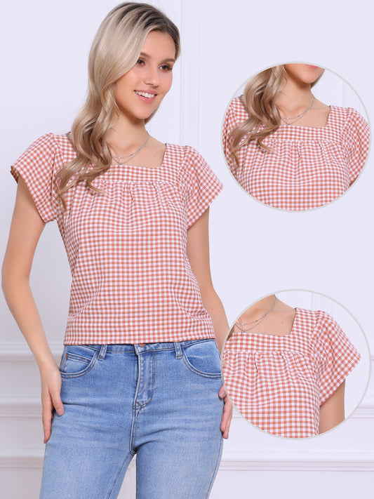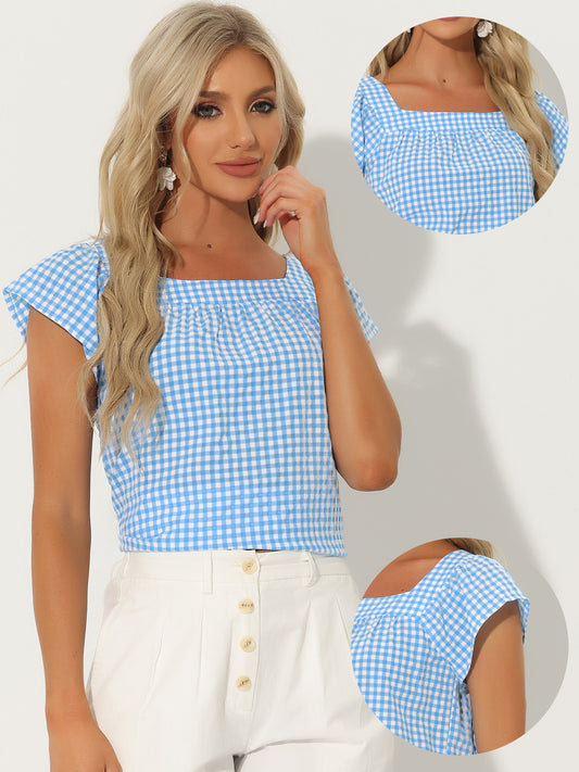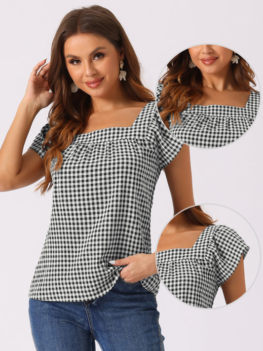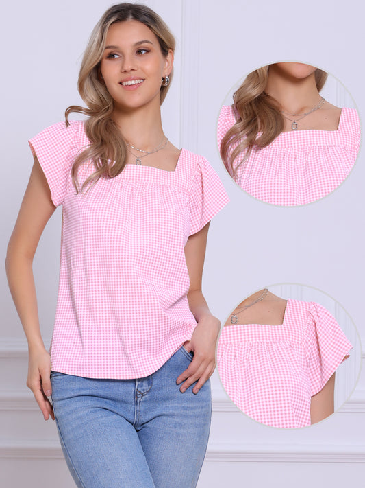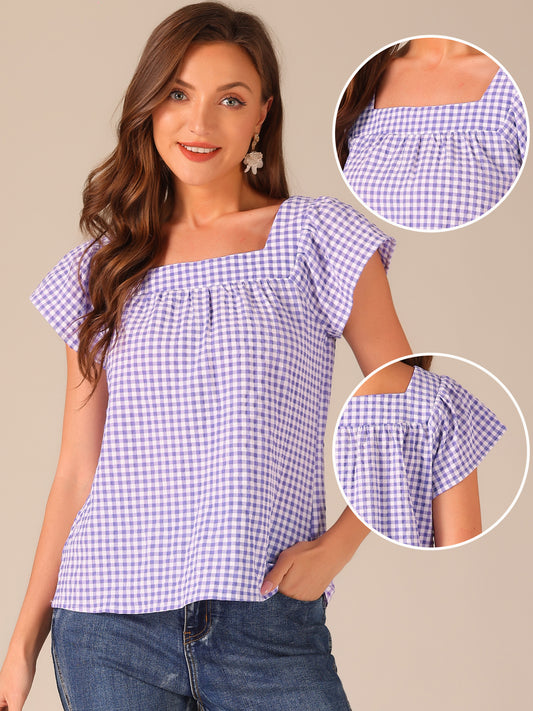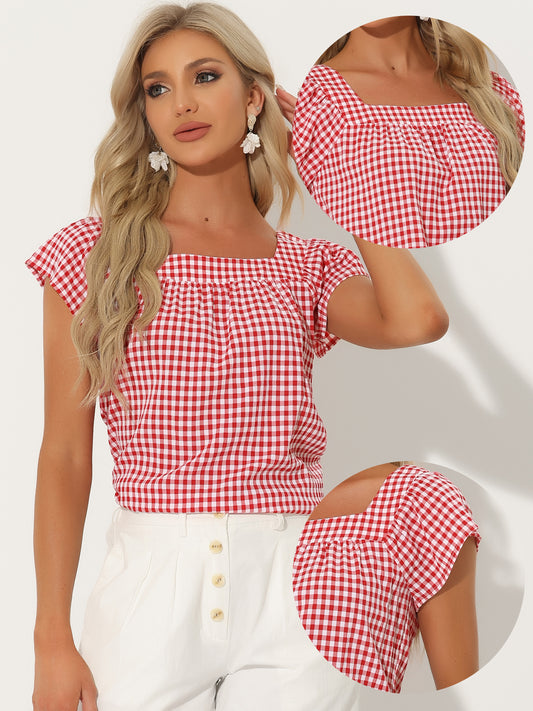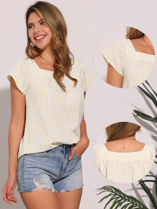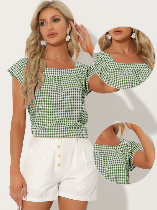 Women's Cap Sleeve Summer Square Neck Gingham Blouse Top