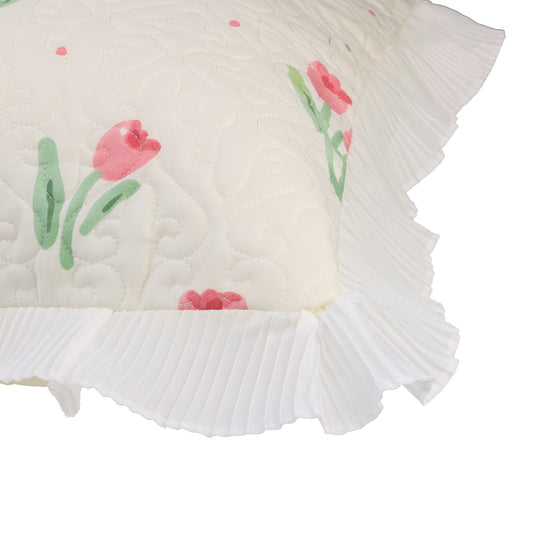 Cotton Pillowcase Set of 2, Tulip Floral Design, Ruffle Trim, Envelope Closure Pillow Covers