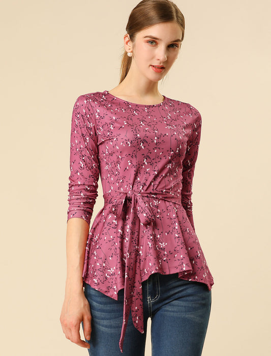 Women's Floral Long Sleeve Asymmetrical Ruffle Hem Belted Flare Peplum Top