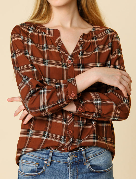 Women's Plaid Shirt Button Up V Neck Long Sleeve Top