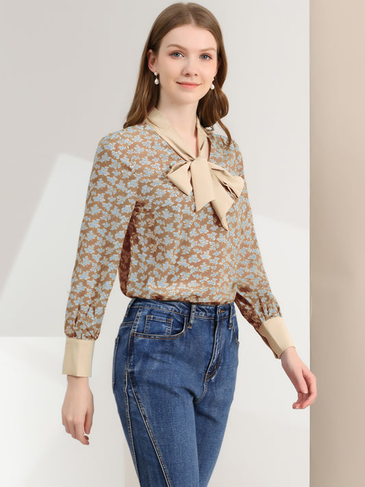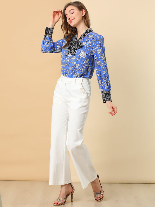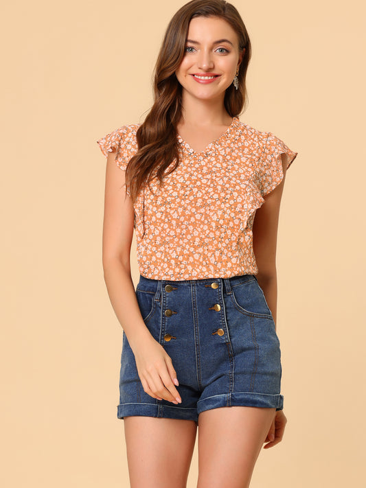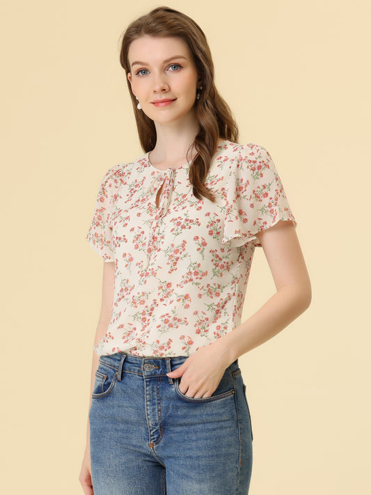 Women's Tie V Neck Flutter Sleeves Elegant Top Floral Blouse