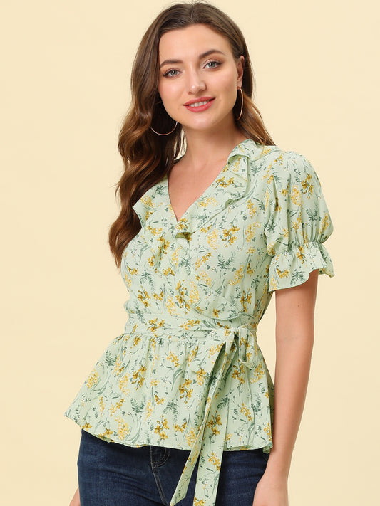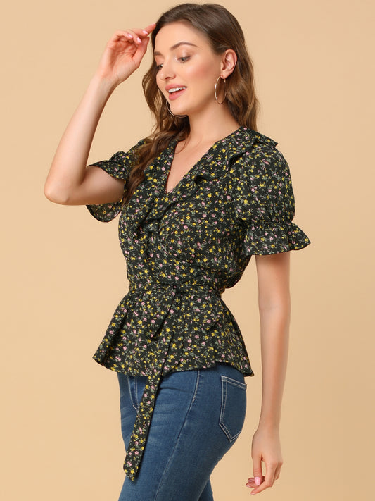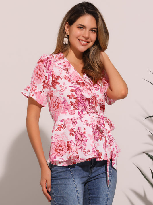 Women's Wrap Blouse Floral Short Sleeve Ruffle V Neck Belted Peplum Top
