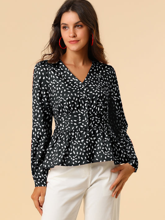 Women's Elegant V Neck Dots Print Smocked Ruffled Hem Button Peplum Blouse