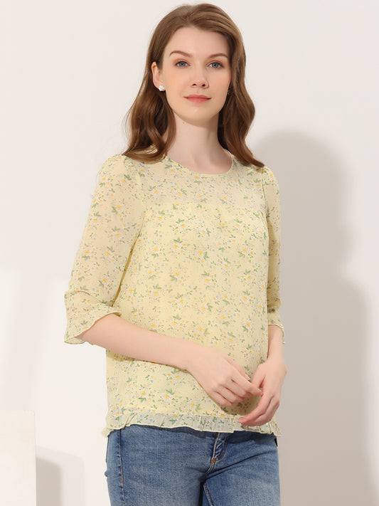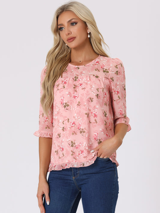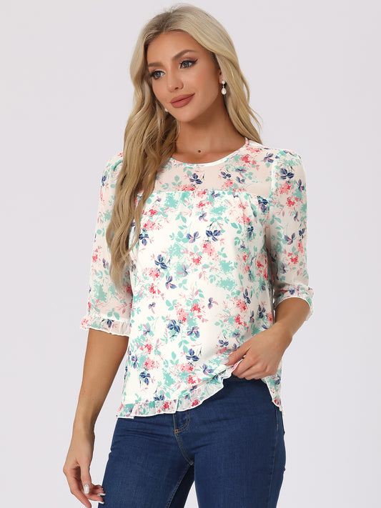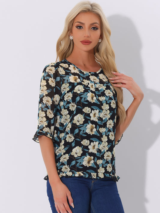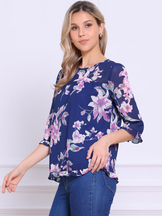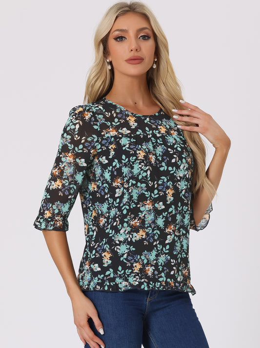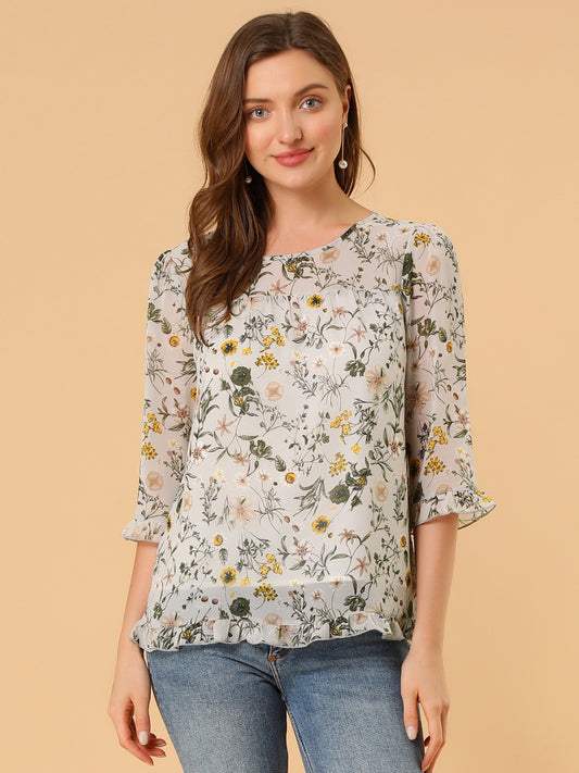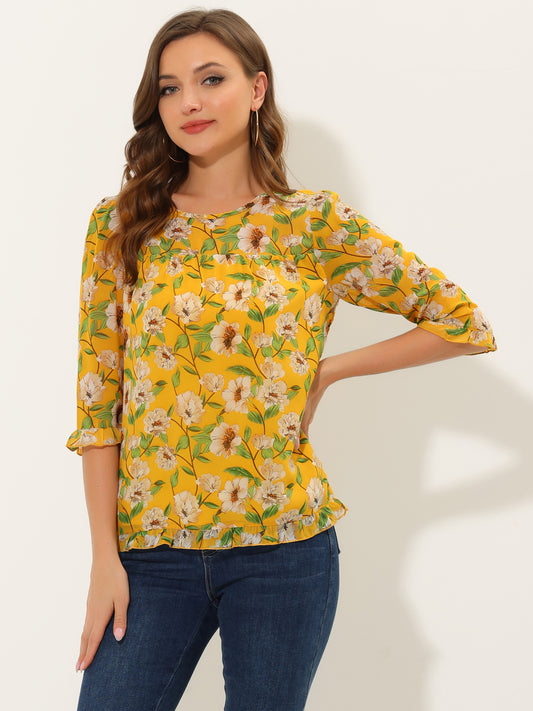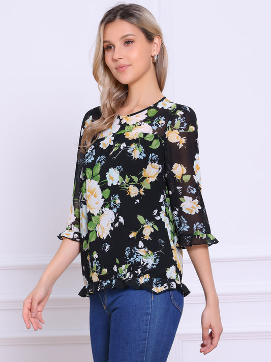 Women's Casual Ruffle 3/4 Sleeve Floral Print Chiffon Blouse