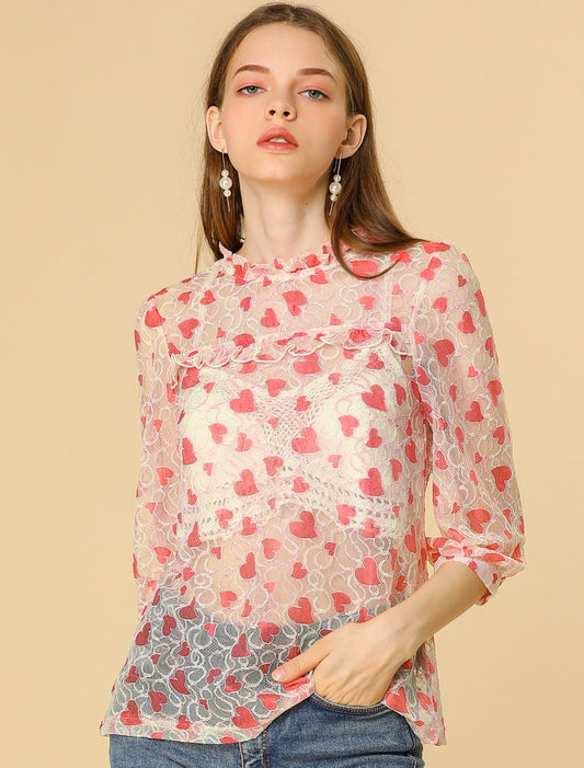 Women's 3/4 Sleeves Ruffle Mock Neck Sheer Lace Top