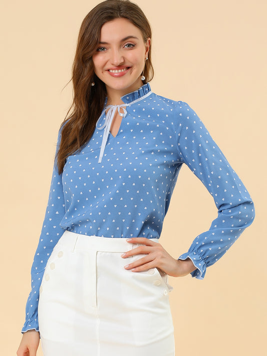 Women's Bow Tie Neck Blouse Ruffled Collar Printed Long Sleeve Top