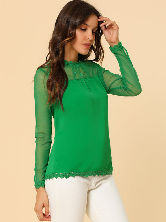 Women's Chiffon Top Elegant Sheer Mesh Lace Long Sleeve Blouse