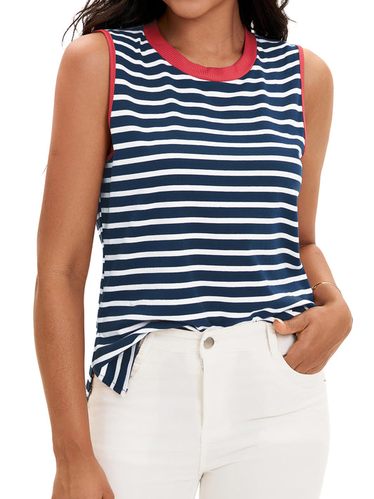 Women Summer Color Block Striped Crewneck Camisole Top Sleeveless Flowy Side Slit Tank Top
