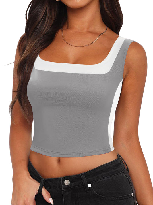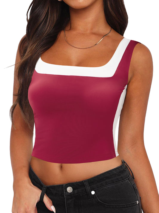 Women Sleeveless Square Neck Crop Top Slim Fit Color Block Tank Top