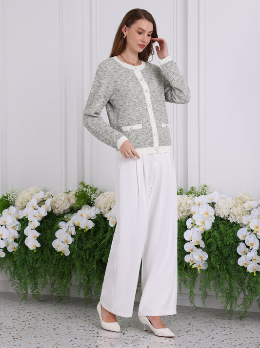 Women's Button Down Cardigan Sweater Crewneck Contrast Trim Long Sleeve Knit Ribbed Jacket