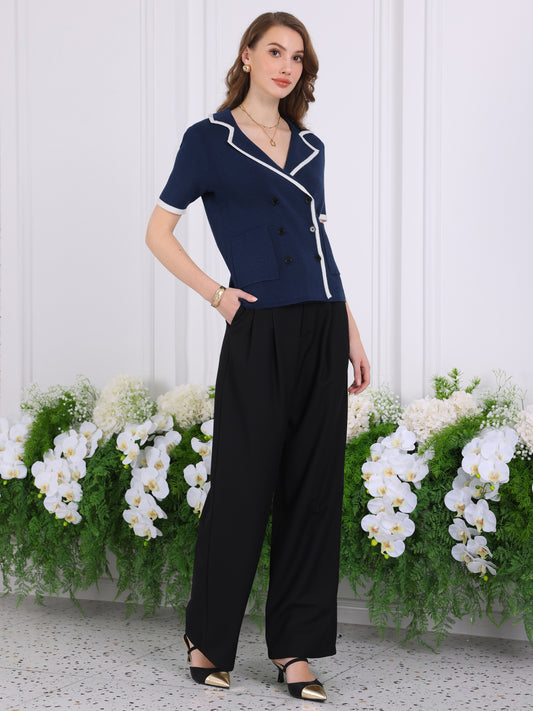 Women's Short Sleeve Summer Cardigan Double Breasted Contrast Color Knit Sweater Jacket Top