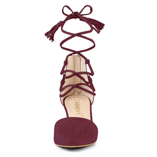 Women Ankle Tie Chunky Heel Pointed Toe Dress Pumps