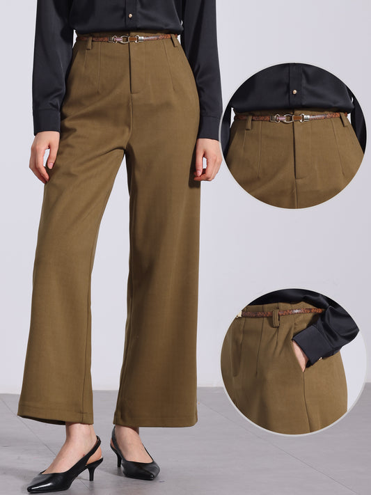 Women's Pants Fall Winter Wool Blend High Waist Wide Leg Zipper Pockets Belt Business Casual Pants