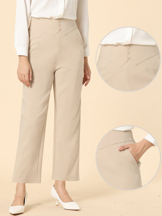 Women's Elegant Business Pants Elastic Waist Button Decor Straight Leg Work Trousers