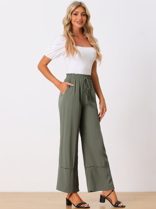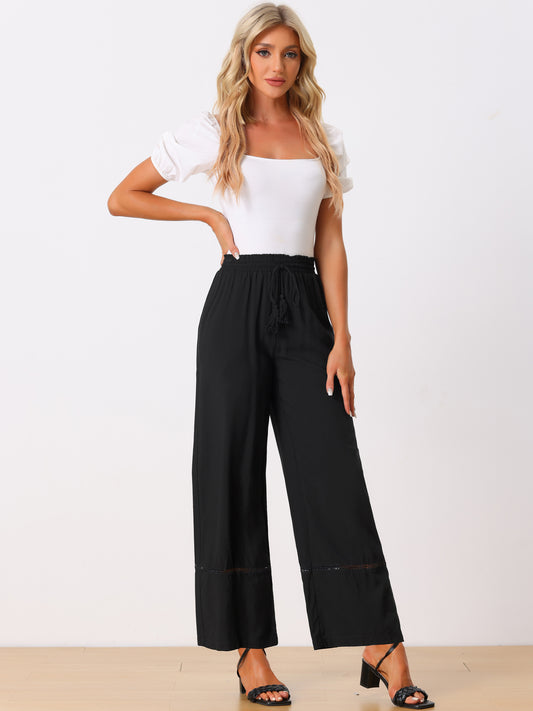 Women's Summer Casual Pants Loose High Waist Drawstring Wide Leg Palazzo Trousers with Pockets