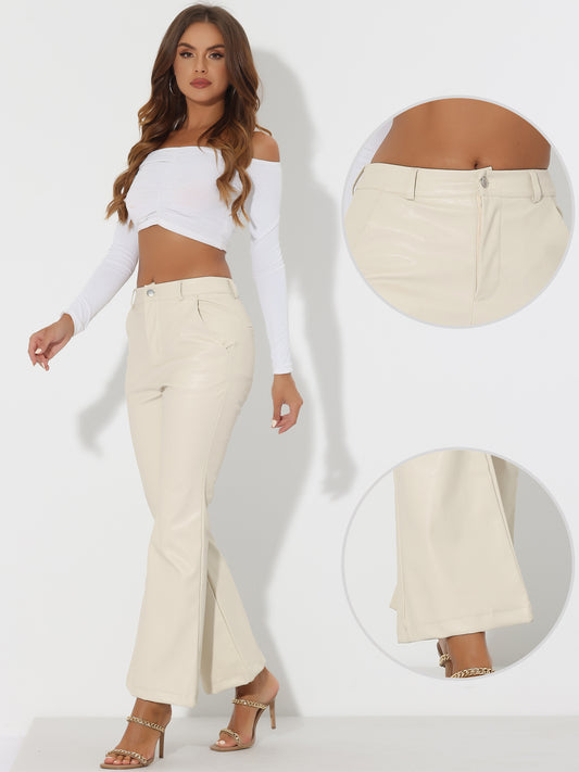 Women's Faux Leather Casual Pants High Waist Bell Bottom Flared Long PU Trousers