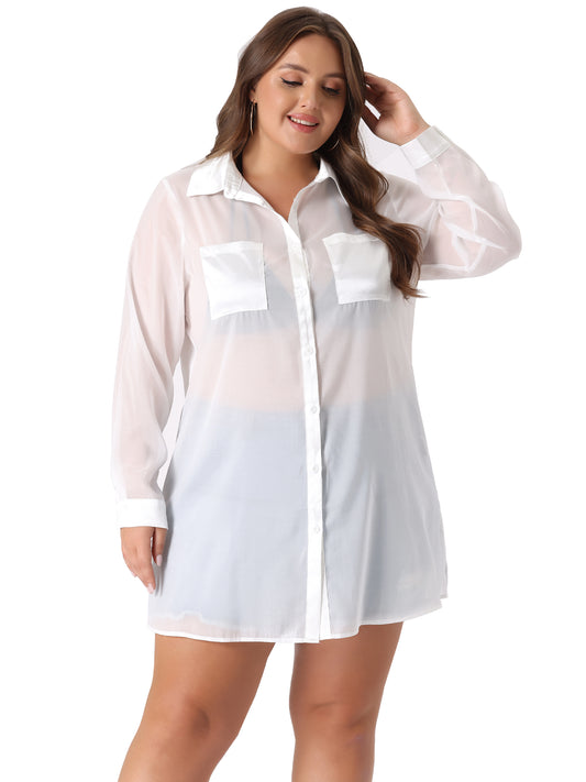 Women's Plus Size Long Sleeves Button Down Solid Sheer Top Shirt