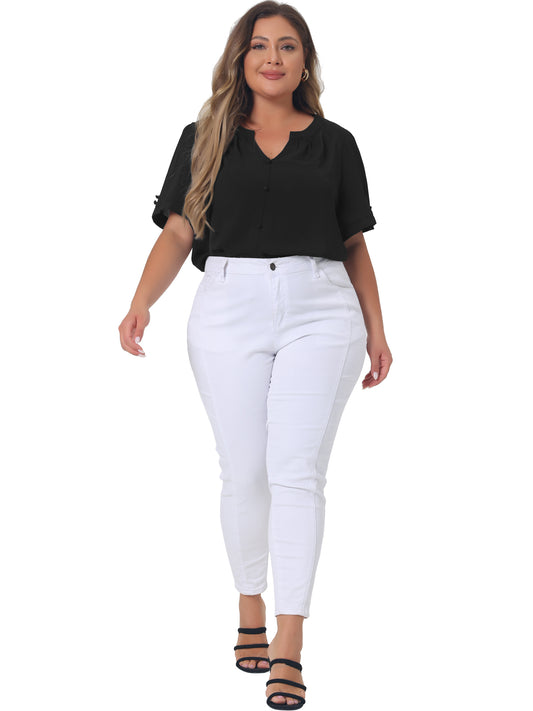 Women Plus Size Button Down Shirt Ruched V Neck Short Sleeve Office Top