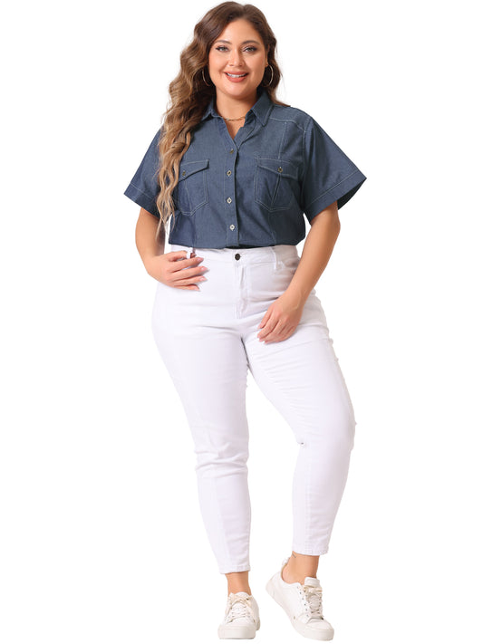 Women Plus Size Chambray Shirt Work Short Sleeve Chambray Button Down Top