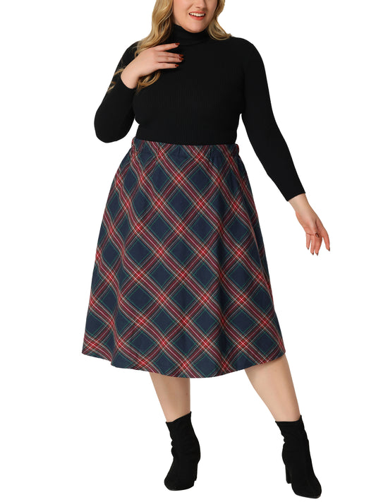 Women Plus Size Vintage Skirt A-line Plaid Printed Flare Elastic High Waist Midi Skirt