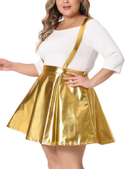 Women Plus Size Shiny Metallic Suspender Skirt High Waisted Holographic Rave Skirt
