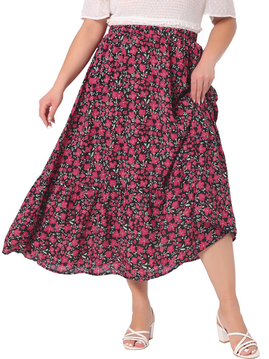 Women Plus Size Skirts Floral Flowy Stretchy Waist Layered A Line with Pocket Summer Maxi Skirt