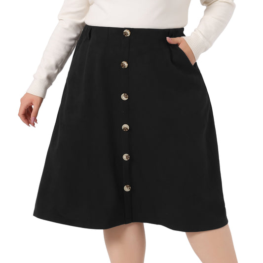 Women Plus Size Skirts Faux Suede Button High Waist A-line Mini Skirt with Pocket
