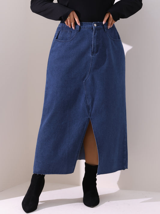 Women Plus Size Denim Skirt Basic High Waist Ripped Hem Pockets Jeans Skirts