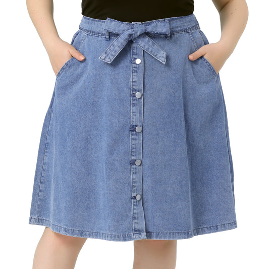 Women's Plus Size Denim Skirts Tie Waist A-Line with Pockets Midi Summer Jeans Skirt